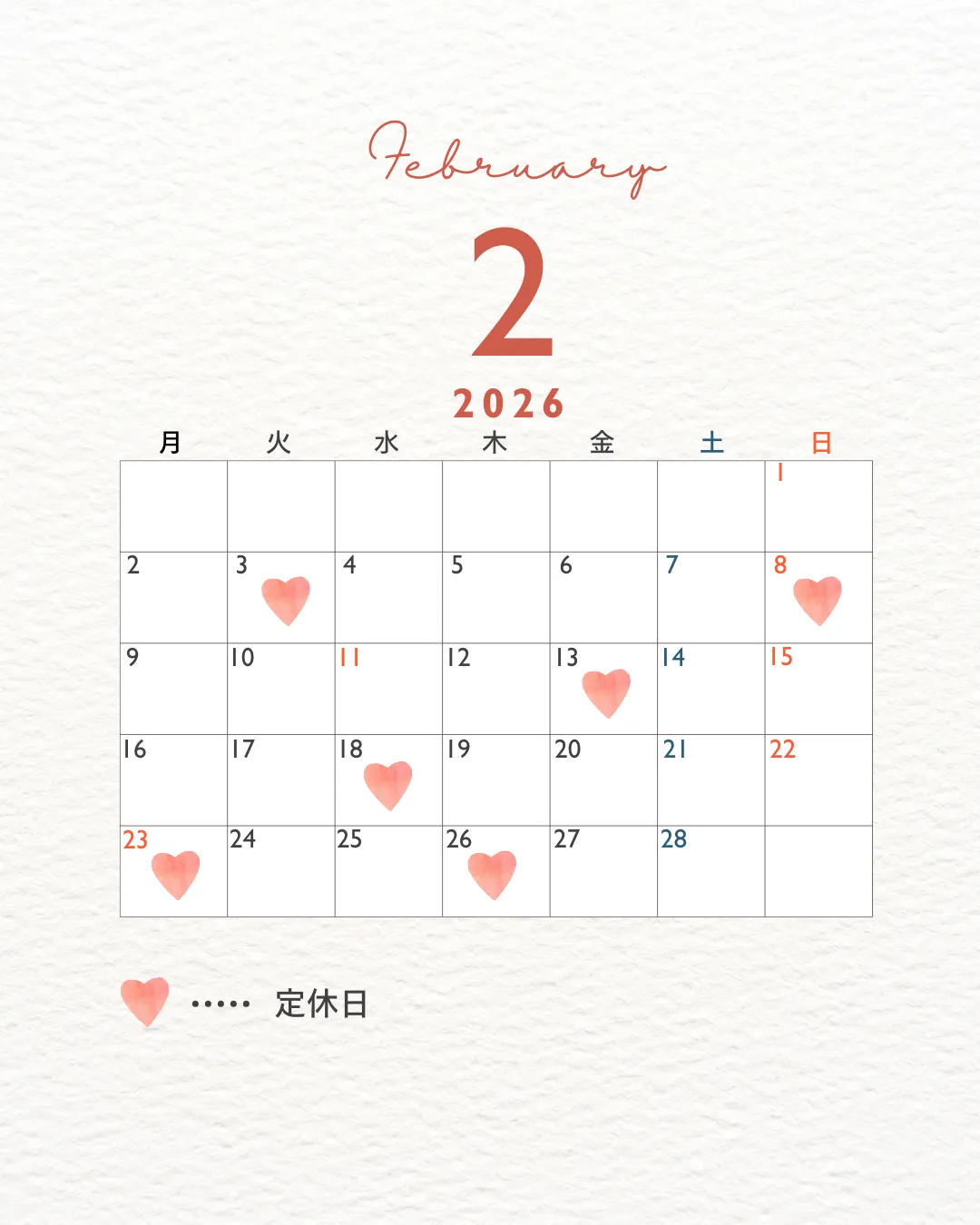 2月のお休みは画像を確認くださいませ![]()